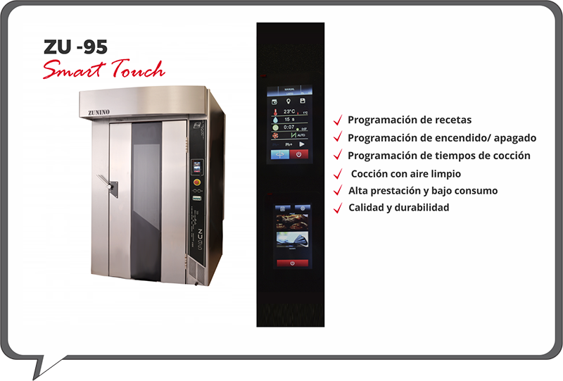 Si de rentabilidad y funcionalidad se trata, el Horno Rotativo ZU-95 es el equipamiento por excelencia que su panadería debe tener. Construido totalmente en acero inoxidable para alta temperatura. El nuevo diseño de la campana permite mayor absorción de vapor y el visor de la puerta cuenta con doble vidrio, optimizando la aislación térmica, al igual que la doble aislación de sus laterales. Su innovador intercambiador de calor, brinda ahorro de combustible y aprovechamiento calórico.