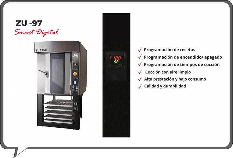 El más pequeño y no por eso menos útil, nuestro Horno Rotativo ZU-97 es por excelencia el más versátil de toda nuestra línea.